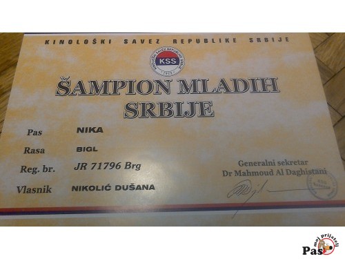 Kada birate stene,uzmi te kvalitetno stene jer ce ono sa Vama provesti vise od deset godina, postane clan Vase porodice.Obraduj te Vasu decu ,najlepsi poklon on za praznike.Muzjak Fido of Golden Crane je iz poznate odgajivacnice iz Sapca, on ima dve odlicne ocene na izlozbama, otac mu ima puno titula. Kuja-Nika je bila tri puta pobednik u razredu mladih, pet puta prvak rase, jedanput drugo mesto u VI FCI grupi, Mladi sampion Srbije, dve pobede u seniorskoj konkurenciji, jedna pobeda na medjunarodnoj izlozbi. Polozen ispit urodjenih osobina, identifikaciona kartica lovackog psa. Nika ima cetiri kuceta, tri trobojna I jedn dvobojac. Cena ukljucuje, ciscenje od unutrasnjih parazita, vakcinacija, rodoslov izdat od strane Kinoloskog saveza Srbije.