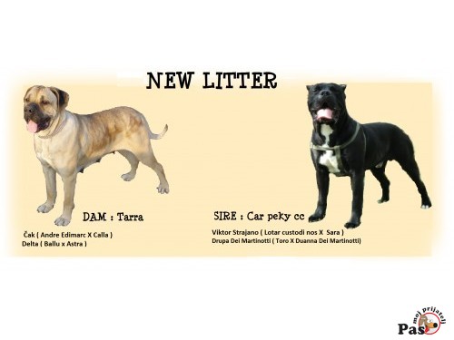 Cane Corso stenad , ocisceni od parazita , vakcinisani i spremni za preuzimanje . Stenci su lepo negovani poseduju zdravstvene knjizice.Roditelji veoma krupni psi! moguca prodaja sa ili bez pedigrea ! Majka / Tarra 5, PRM jednom izlagana Otac Car Peky cc / CHSRB 4XPRM 6XCAC CACIB 4XBOB