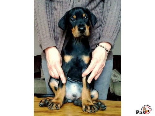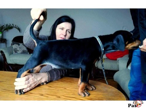 Stenci dobermana vrhunskih krvnih linija. Ostenjeni 31.12.2017. god U ponudi su 2 muska i 2 zenska steneta, crne boje. Strucno odnegovani, redovno cisceni od parazita, vakcinisini. Stenci izuzetnog kvaliteta, ogromnog izlozbebog potencijala. Prodaju se iskljucivo sa rodovnikom, po zelji buduceg vlasnika i pasosem sa mikrocipom. Spremni su za preuzimanje. o: Cowboy Lucky Luck di Altobello born: 22.03.2014. M: Beowulf ( Maxim di Altobello - Birba Kira di Villa Conte ) F: Freya Flemming di Altobello (Macho di Altobello - Zuly Lady di Altobello) health: official reading hip dysplasia HD-A official reading diplasia elbow ED-0 DNA DCM - negative Work: BH IPO 1 Show: INTERNATIONAL CHAMPION CHAMPION OF SERBIA CHAMPION OF MACEDONIA GRAND CHAMPION OF MONTENEGRO CHAMPION OF MONTENEGRO YOUNG CHAMPION OF SERBIA YOUNG CHAMPION OF MONTENEGRO Working class: EXC, 4th place IDC 2017 (Hans Wiblishauzer, Thomas Becht, Attilio Polifrone, Tamas Dohoczki, Josep Maria Bulo) CLASS WINNER Working class Balkan sieger 2017 Kragujevac ( Armin Hoppe ) CLASS WINNER Working class Doberman kup 2017 Bačka Palanka ( Rada Istvan ) Trofeo CALIANDRO 2017. Champion class EXC 3th place (Attilio Polifrone; Erika Szokol; Rudi Killmaier) CHAMPION CLASS WINNER; CLUB WINNER; BEST MALE ON SHOW Bucharest trophy 2016 Romania ( Fabricio la Rocca ) CHAMPION CLASS WINNER Carpathian cup 2016 Romania ( Erika Szokol ) Trofeo CALIANDRO 2016. intermedia class EXC 4th place (Pezzano, Polifrone, Coppo) CLASS WINNER Working class Doberman kup 2016 Novi Sad ( Odstenk Schenk Ilonu ) CLASS WINNER 13-18m Doberman kup 2015 Leskovac ( Attilio Polifrone) CLASS WINNER Open class Doberman kup 2015 Novi Sad (Thord Bystrom) BEST YOUNG MALE Doberman kup 2015 Niš (Armin Hoppe) BEST YOUNG MALE Doberman kup 2015 Istanbul (Thomas Becht) BEST YOUNG MALE Doberman kup 2015 Ruma (Linda Volarikova) 1 * BEST IN SHOW 1st place 3 * BEST OF GROUP 1st place 1 * BEST OF GROUP 2nd place 1 * BEST OF GROUP 3th place 1 * BEST OPPOSITE SEX 9 * BEST OF BREED 7 * CACIB 4 * R. CACIB 19* CAC 1 * JUNIOR BEST IN SHOW 1. place 2 * JUNIOR BEST OF GROUP 6 * JUNIOR BEST OF BREED 12*J. CAC 1 * puppy BEST IN SHOW 1. place 1 * puppy BEST OF BREED VP1 Pappy Balkan sieger 2014 Doberman cup Kragujevac 1 * baby BEST IN SHOW 3. place 3 * baby BEST OF BREED m: Felicita Flair von Ashanti born: 23.11.2015. M: Tahi Reme Max ( Pride of Russia Ferro - Tahi Reme Giniti) F: Veronika del Mediano ( Teraline Midgard - Pandora del Mediano) 1* VP1 puppy class CAC Intermedia class Health: DCM DNA - N/N
