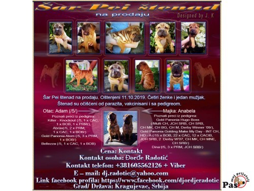 Šar Pei štenad na prodaju. Oštenjeni 11.10.2021. Četiri ženke i jedan mužjak. Štenad su očišćeni od parazita, vakcinisani i sa pedigreom. Otac: Adam (/5/) Majka: Anabela (/5/)